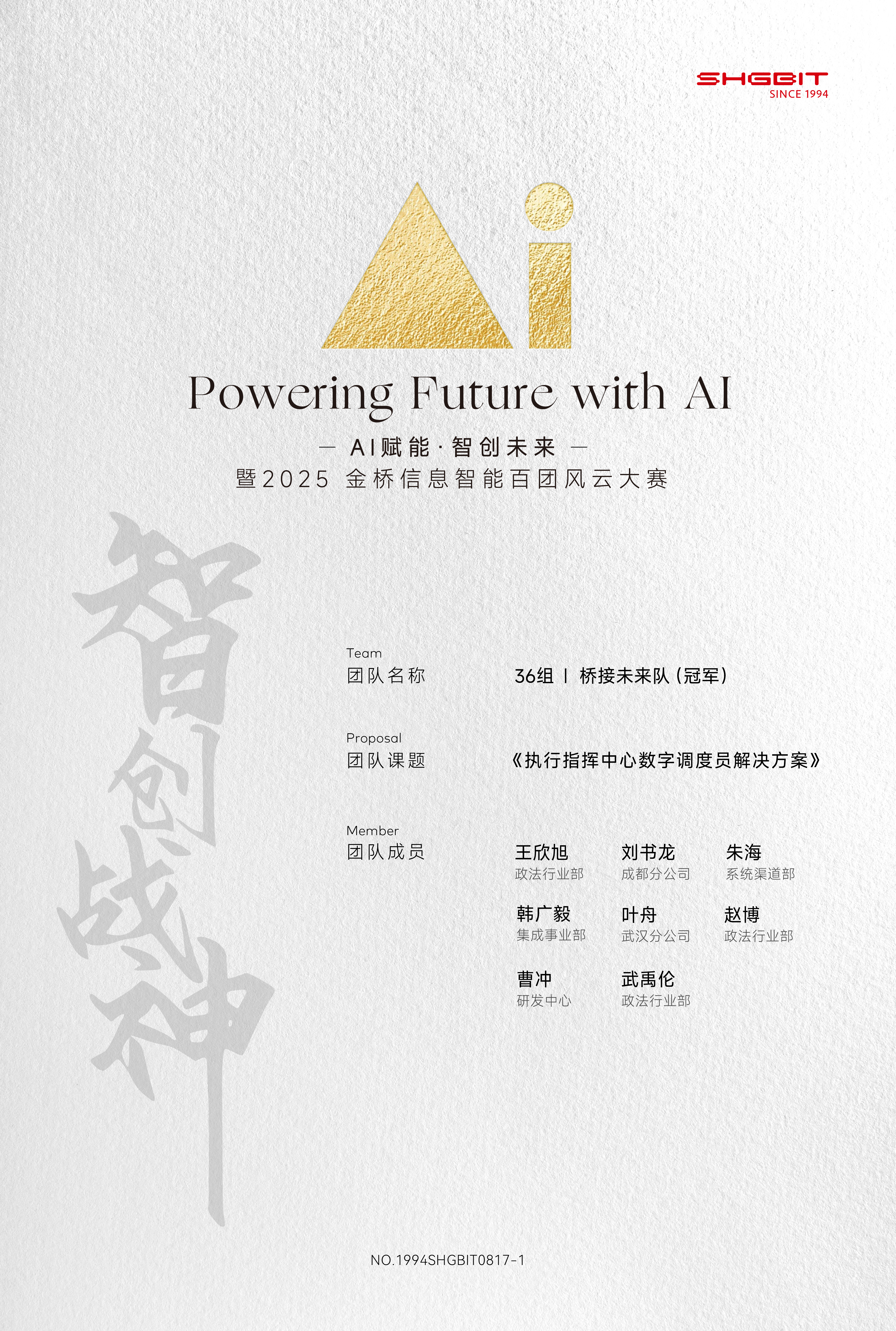 經(jīng)過(guò)4小時(shí)的高密度攻防鏖戰,冠軍寶座被 橋接未來(lái)隊-36 強勢鎖定!他們的【 執行指揮中心數字調度員解決方案 】以絕對優(yōu)勢俘獲評委團的芳心,捧回智創(chuàng )戰神大力神杯!亞軍和季軍分別被 Zi聲隊-43  Ai你所愛(ài)-38 收入囊中。
